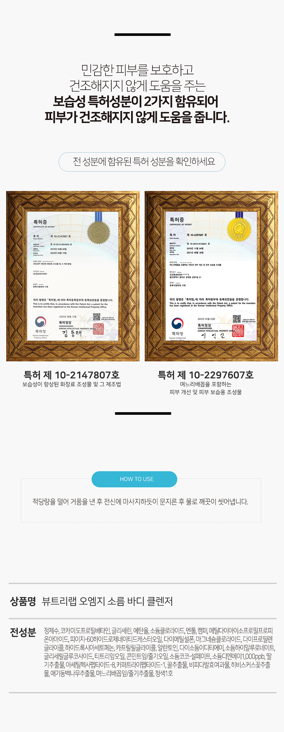 사용방법 적당량을 덜어 거품을 낸 후 전신에 마사지하듯이 문지른 후 물로 깨끗이 씻어냅니다.